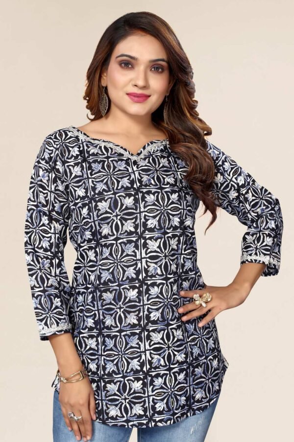 Women’s Dark Blue Cotton Blend Floral Printed Top