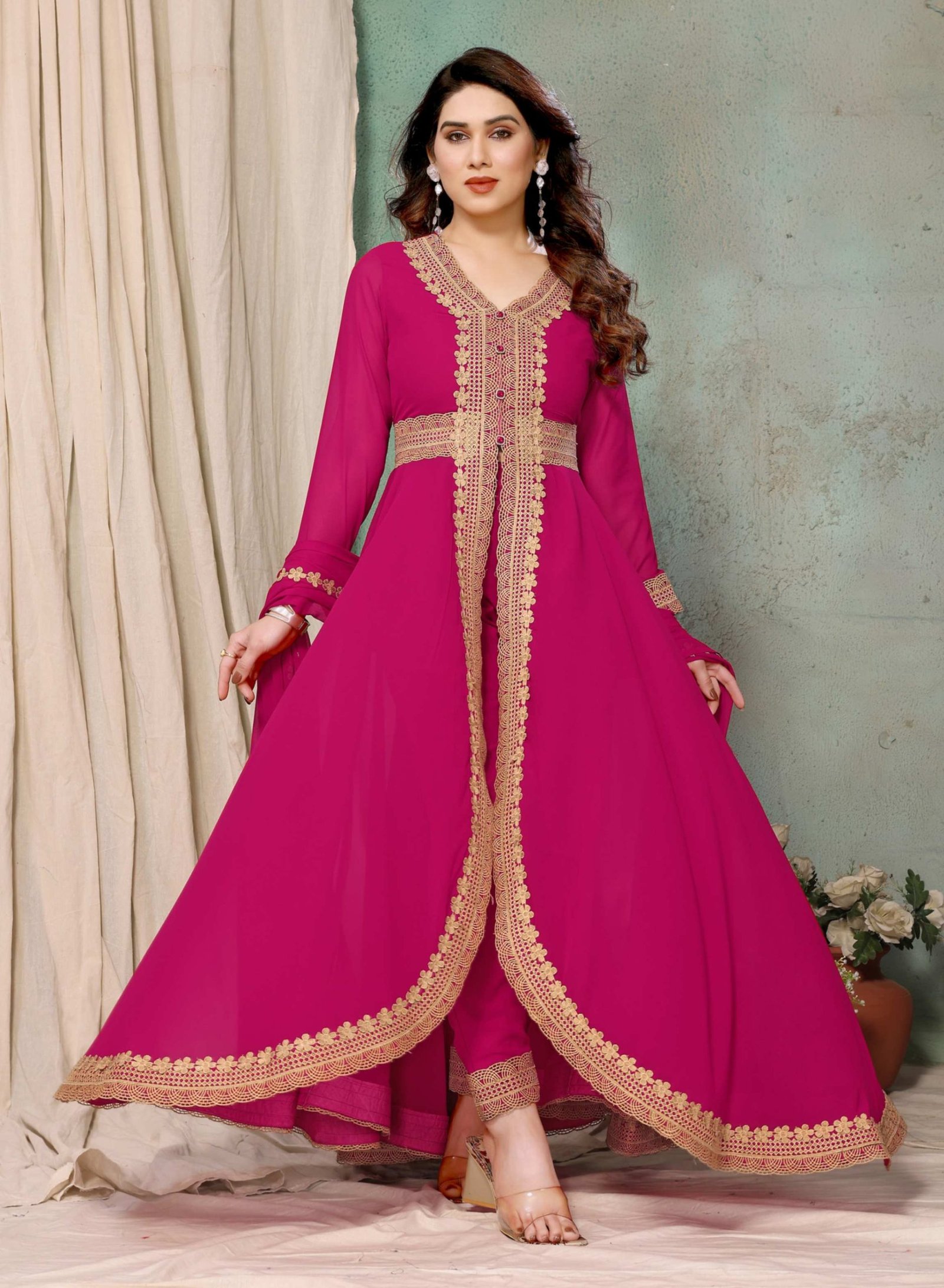 Introducing our Pakistani Kurta Pant Set, crafted with high-quality Georgette fabric and inner Butter Crepe for a comfortable and luxurious feel. The Kurta showcases a stylish v-neck design and full sleeves, exuding elegance and sophistication. With its alluring lace detailing throughout, this set is sure to make a statement. The front button accents add a touch of charm and uniqueness to the ensemble. The pant have a partially elasticated for a perfect fit and features lace detailing at the bottom, adding a trendy and feminine touch. Completing the set is a beautifully decorated dupatta with a lace border, enhancing the overall look. Perfect for special occasions or festive celebrations, this Pakistani Kurta Pant Set is a must-have addition to your wardrobe.