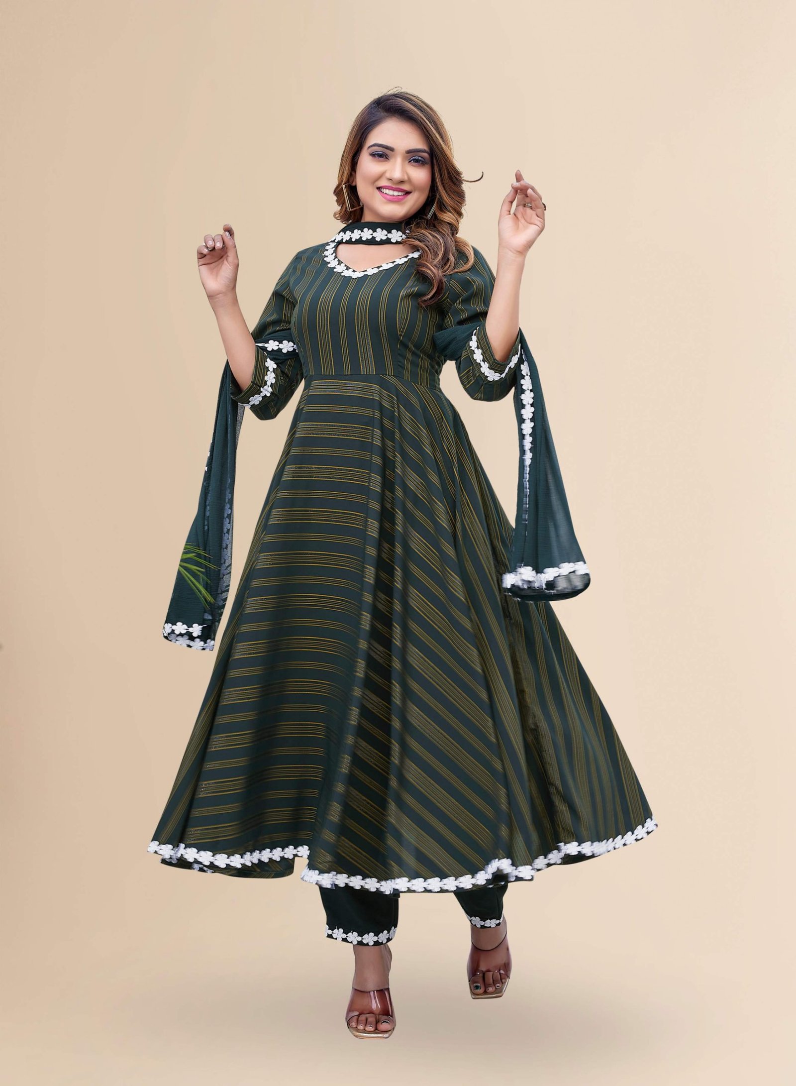 Redefine ethnic by flaunting this lovely kurta set that’s the perfect blend of modern and traditional styles. This bottle green kurta set made of premium BSY Polyester fabric, and dupatta is crafted from bemberg chiffon fabric. The anakali styled kurta features are V-Neck with lace accents, 3/4 cuffed sleeves, and flared silohutte with lace detailing at hem. This traditional wear pant have a partial elasticated at waist,one side pocket and down of the pant have a lace work. Pair this women kurta set with statement earrings for casual outings.