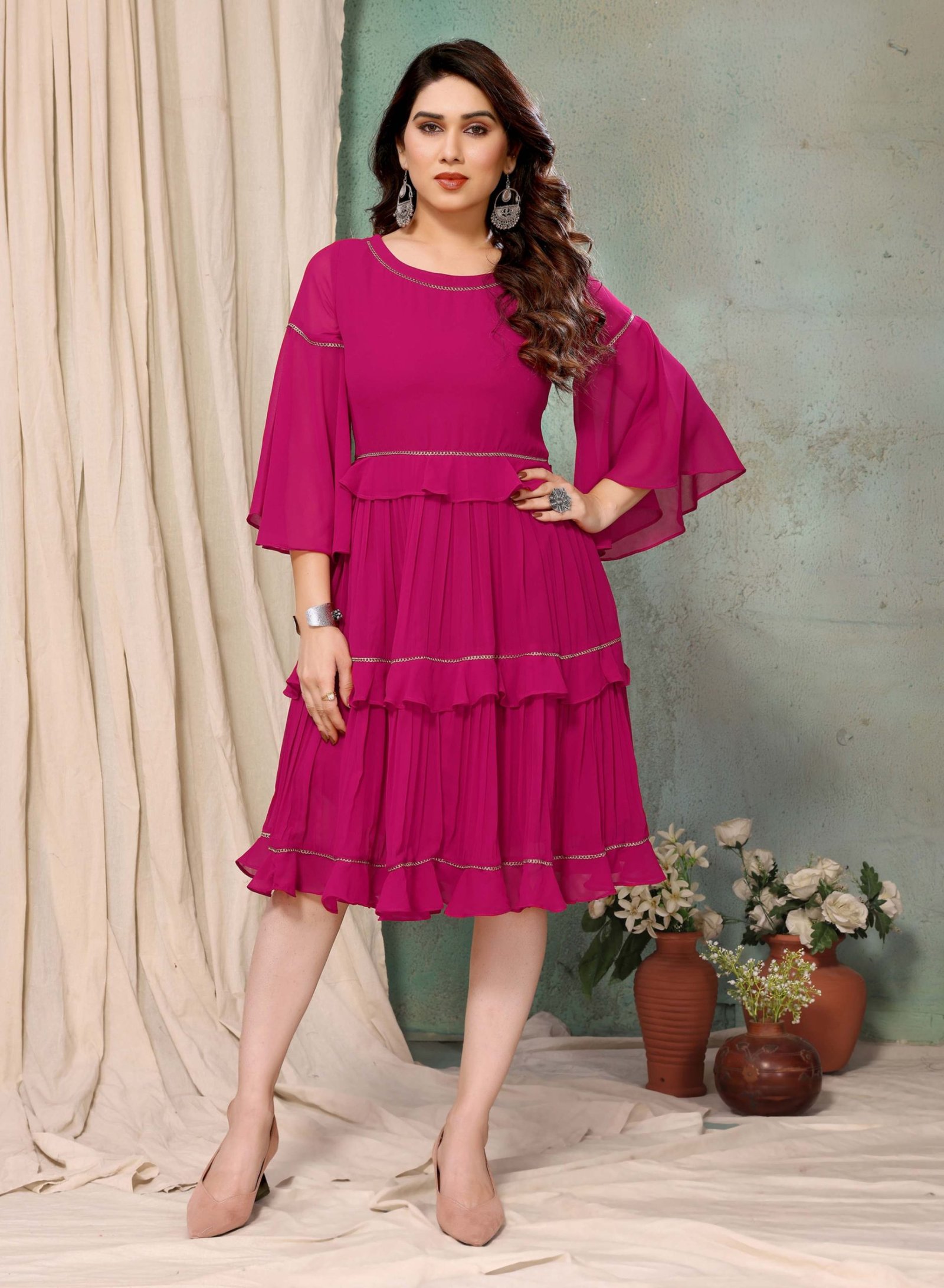 Its time to look beyond usual and wear styles that stand out. With this knee length dress for women timeless style and versatile design, you’ll be sure to love this dress for years to come. This women dress is made from georgette fabric with the use butter crepe for comfortable and luxurious feel. This pink dress features a beautiful a round neck, and trendy bell sleeves for a touch of elegance. Designed with intricate lace accents, this layered dress adds a feminine and romantic touch to your look. The dress have a flared silhouette that will make you feel confident and stylish. Whether you’re attending a special occasion or simply want to elevate your everyday style, this dress is a must-have in your wardrobe.