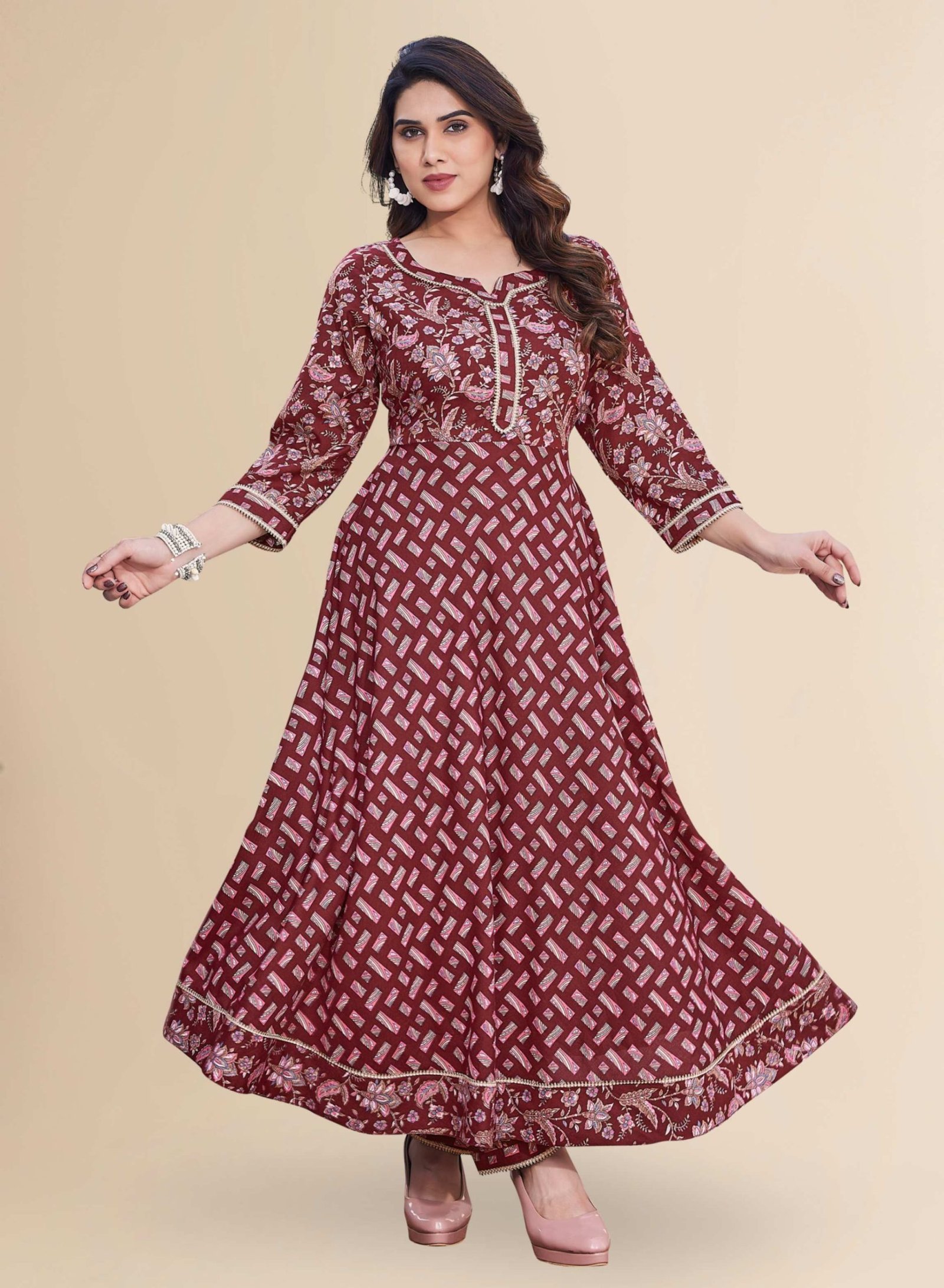 Step into the world of refined aesthetics with our stunning Kurta Pant Set. This maroon printed kurta pant set, a stylish and comfortable addition to your wardrobe. Made from high-quality cotton blend fabric. This floral printed A-line style kurta features a V-cut neck with lace detailing and 3/4 sleeves. The kurti also showcases beautiful foil work, enhancing its overall appeal. The pant is designed with a partial elasticated waist and a convenient side pocket for added comfort. Elevate your ethnic wardrobe with this Kurta Pant Set, a perfect choice for festivities, formal gatherings, or even casual outings.