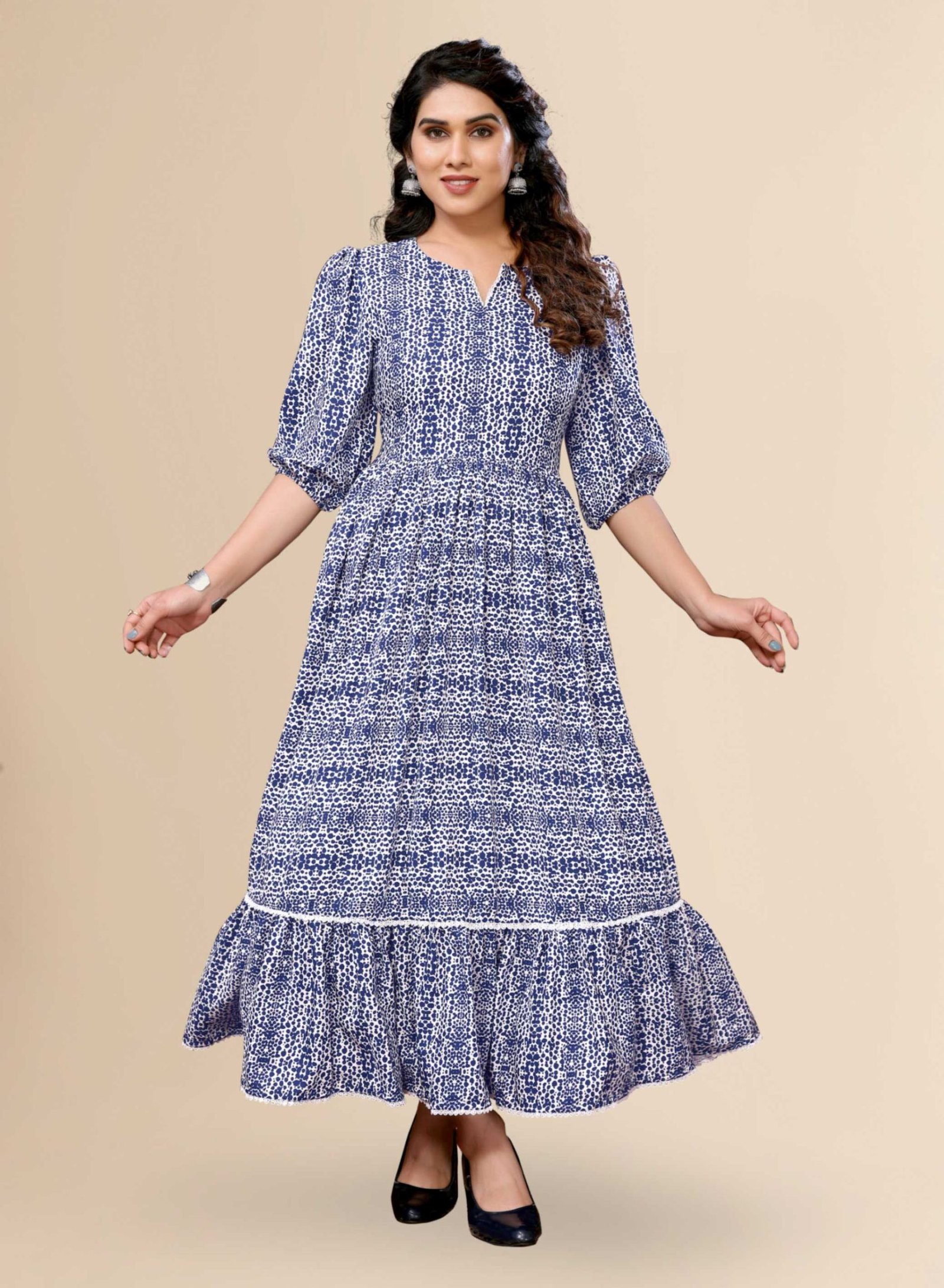 Introducing our exquisite blue printed dress, a perfect blend of comfort and style. Crafted with a polyester blend fabric, this dress offers a lightweight and breathable feel. The navy blue color adds a touch of elegance, while the animal printed pattern adds a playful charm. The v-cut neck and bishop sleeves enhance the overall feminine appeal, while the gathered waist and flared silhouette in this dress. This dress has ruffles at the bottom and beautiful lace detailing. Pair this dress with hairbands and heels, and add elegance and modernity to your look.