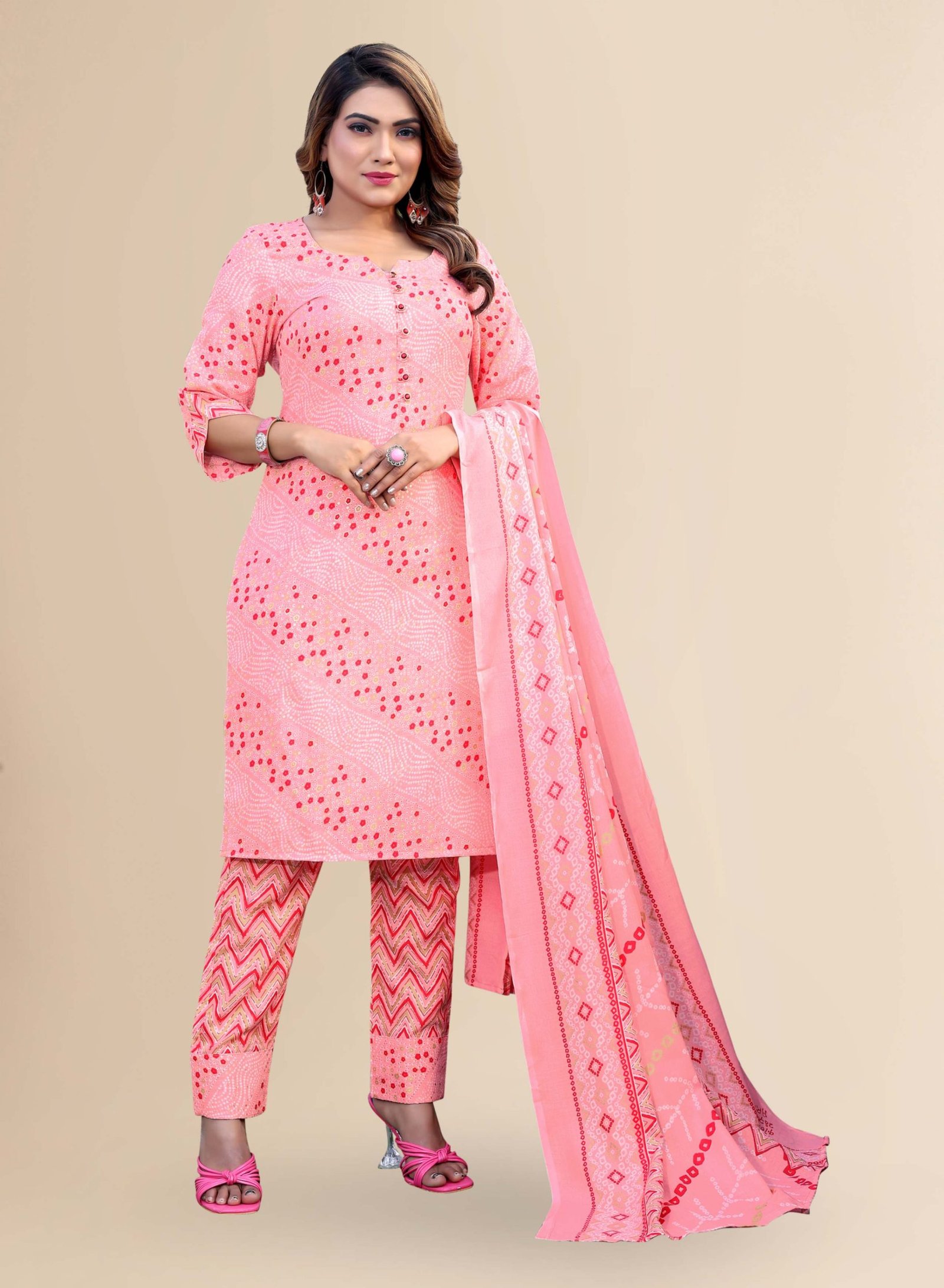 Get ready to make a style statement with this stunning bandhani print kurta pant dupatta set and crafted from cotton blend fabric. The 3/4 sleeves and v-cut neck add a touch of elegance, while the foil print adds a hint of glamour. The straight kurta and chevron printed partial elasticated pant ensure a comfortable fitting . Perfect for any occasion, this set is a must-have for your wardrobe.