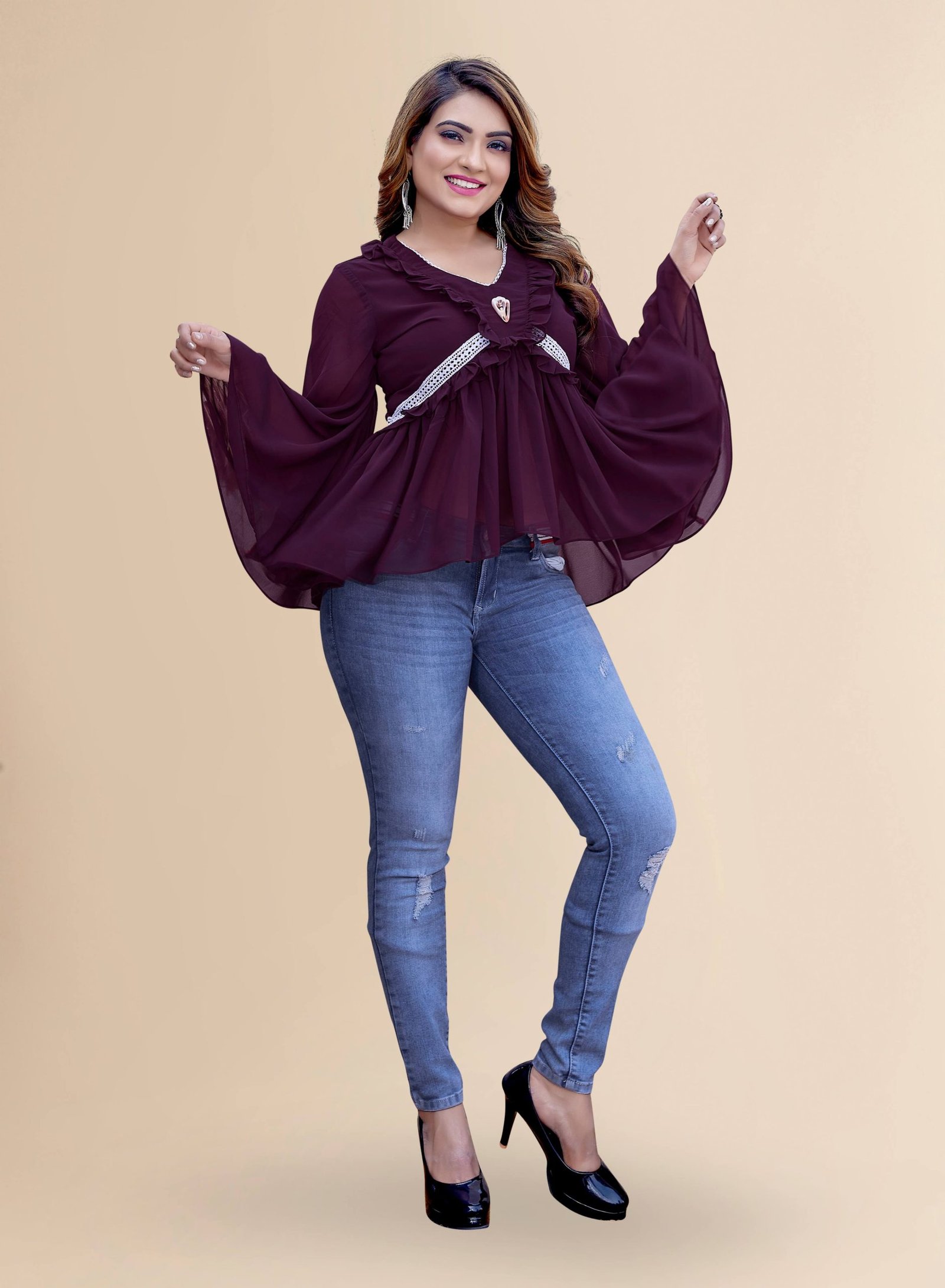 Include this chic wine-colored women’s top in your collection of western wear to enhance your sense of style and self-expression. The hip length top for women is made of breathable georgette fabric with a cotton lining. The entire looked of short tops for women has solid print and cowry at the yoke. This woman top features V-neck with ruffles detailing, bell sleeves and flared silhouette for unique and authentic sustainable fashion. Whether you’re out with friends or with family, this casual ruffle top will surely give you a vibrant look as cheerful as you are. Pair this top with trousers and heels, and add elegance and modernity to your look.