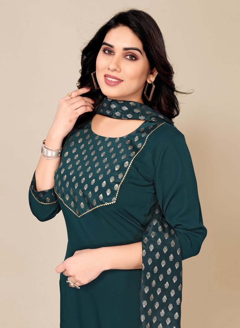 Women’s Purssian Blue Foil Printed Kurta With Dupatta