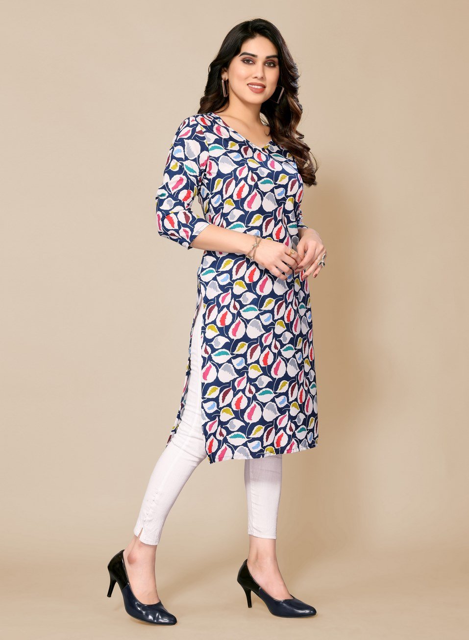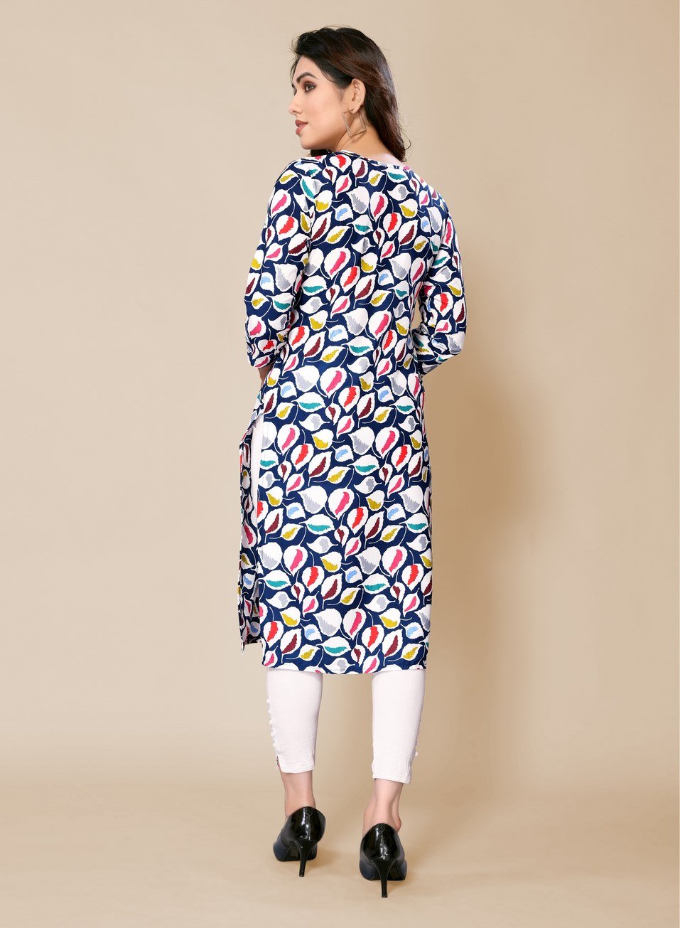 Women’s Purssian Blue Leaf Printed Straight Kurti