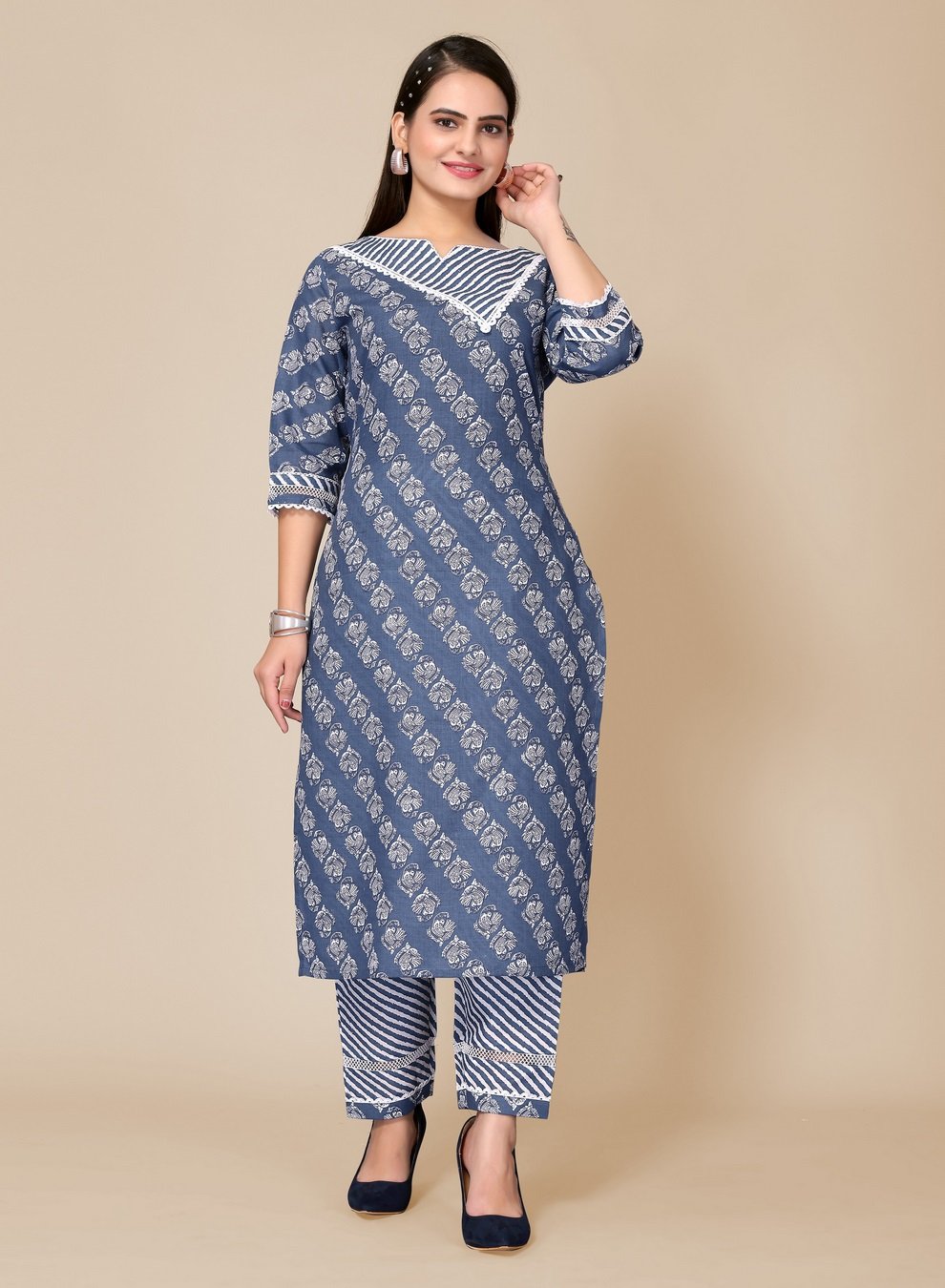 Women’s Steel Blue Floral Printed Kurta Pant Set