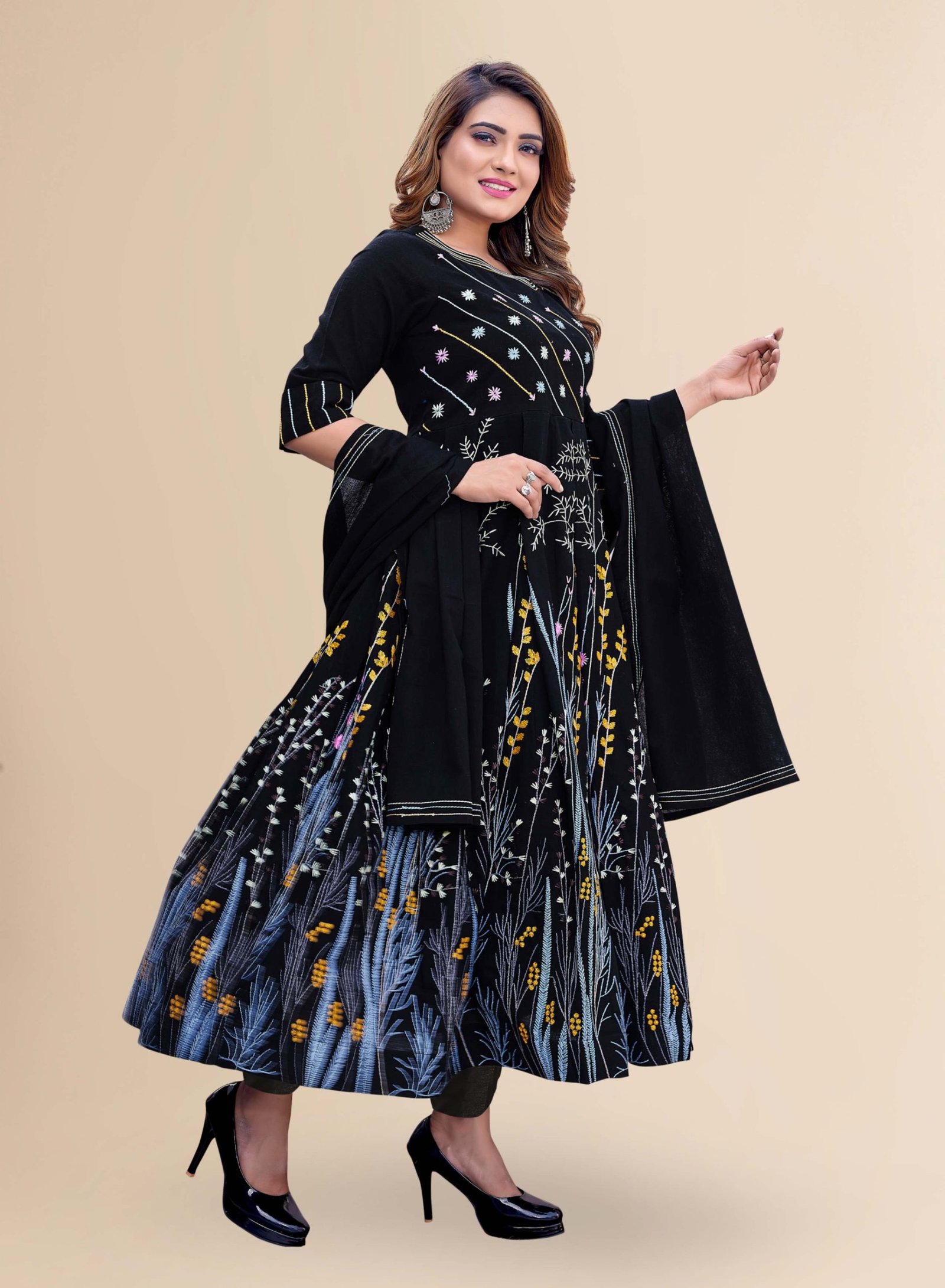 Refresh your wardrobe with this women kurta pant set. This floral embroidery kurta set completes your look for your special occasions. Experience the regal elegance of this adorable black kurta pant with dupatta set. This Kurta suit set made of linen fabric with use for inner butter crepe for comfortable feel. The anarkali features are V-Neck, 3/4 Sleeves, and decorated with thread embroidery flared silohutte. The linen pant have a partially elasticated waist. Pair with classy heels and flats for completes the Ethnic Look and Steal those second glances as you make a stylish entry by wearing this set for women for any occasion, festival or traditional style.